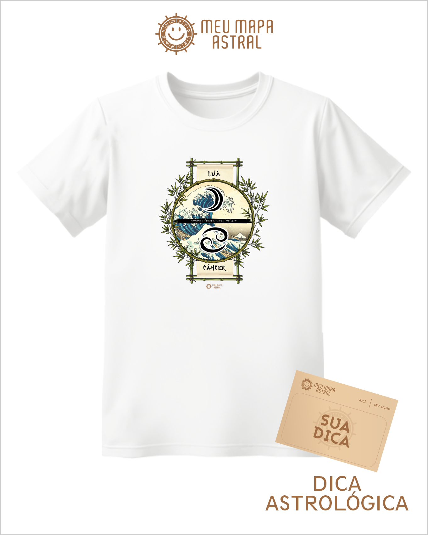 Feita 100% de algodão super confortável, essa camiseta traz seu signo Câncer, seu astro regente Lua e suas características mais marcantes, inspirada no mestre do ukiyo-e, Katsushika Hokusai.
