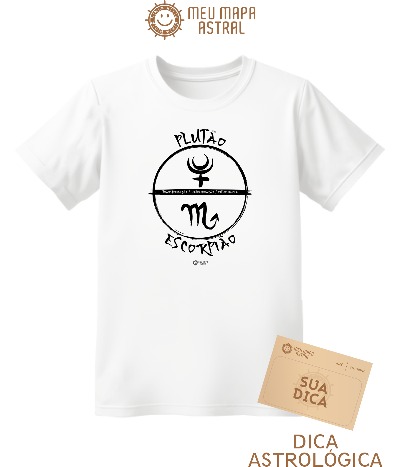 Camiseta Escorpião/Plutão Gráfica — para quem quer mostrar seu poder cósmico com muito estilo e conforto! Feita 100% de algodão, ela é tão confortável que você vai querer usar até para decifrar segredos do universo. Com diversas cores vibrantes, traz o símbolo do signo de Escorpião, seu astro regente Plutão e suas características marcantes, tudo com uma estampa oriental que é puro mistério e charme. Vista seu lado intenso e arrase por aí, porque Escorpião não passa despercebido!