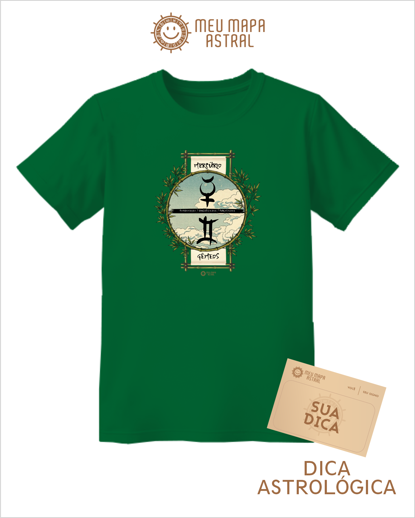 Feita 100% de algodão, esta camiseta une seu signo Gêmeos, o astro regente Mercúrio e suas principais características, inspiradas no mestre do ukiyo-e, Katsushika Hokusai.
