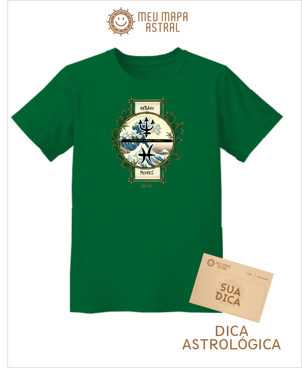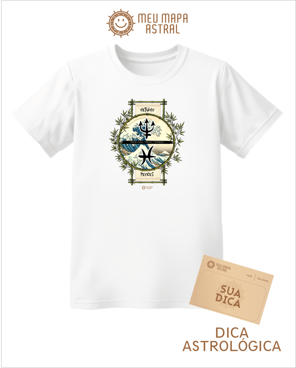 Camiseta Peixes/Netuno Ilustrada — para você que nada nas águas do místico com muito estilo! Feita 100% de algodão, super confortável, essa camiseta traz seu signo Peixes, seu astro regente Netuno e suas características, em uma estampa astrológica inspirada no mestre do ukiyo-e, Katsushika Hokusai. simbolizando seu elemento água. Vista seu lado sonhador, encantador e um pouquinho doido — afinal, ser Peixes é isso mesmo! Se joga nessa onda cósmica e arrase por aí!