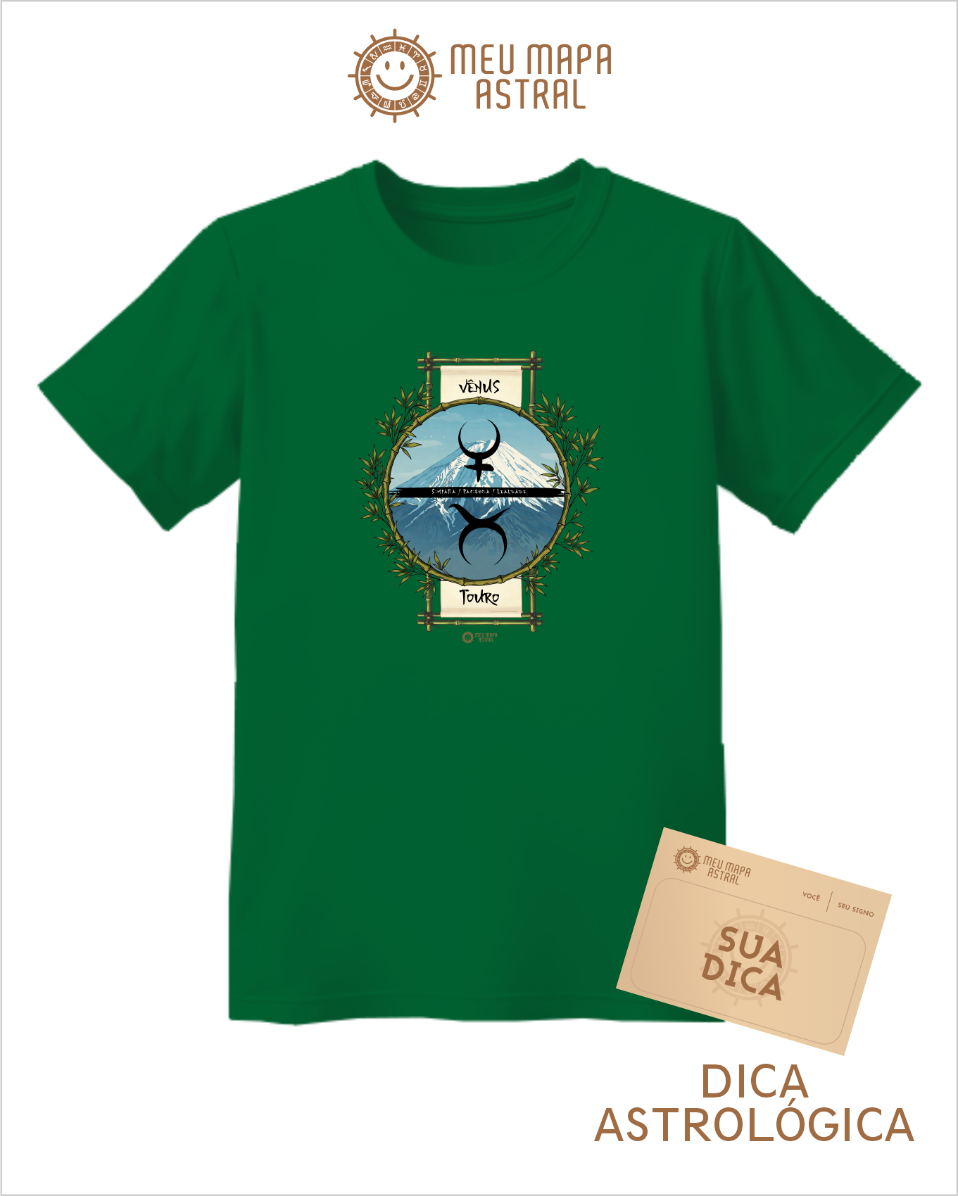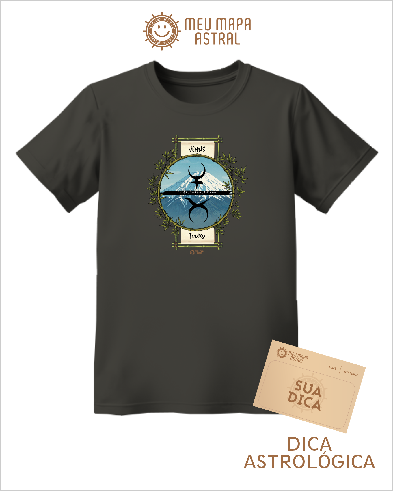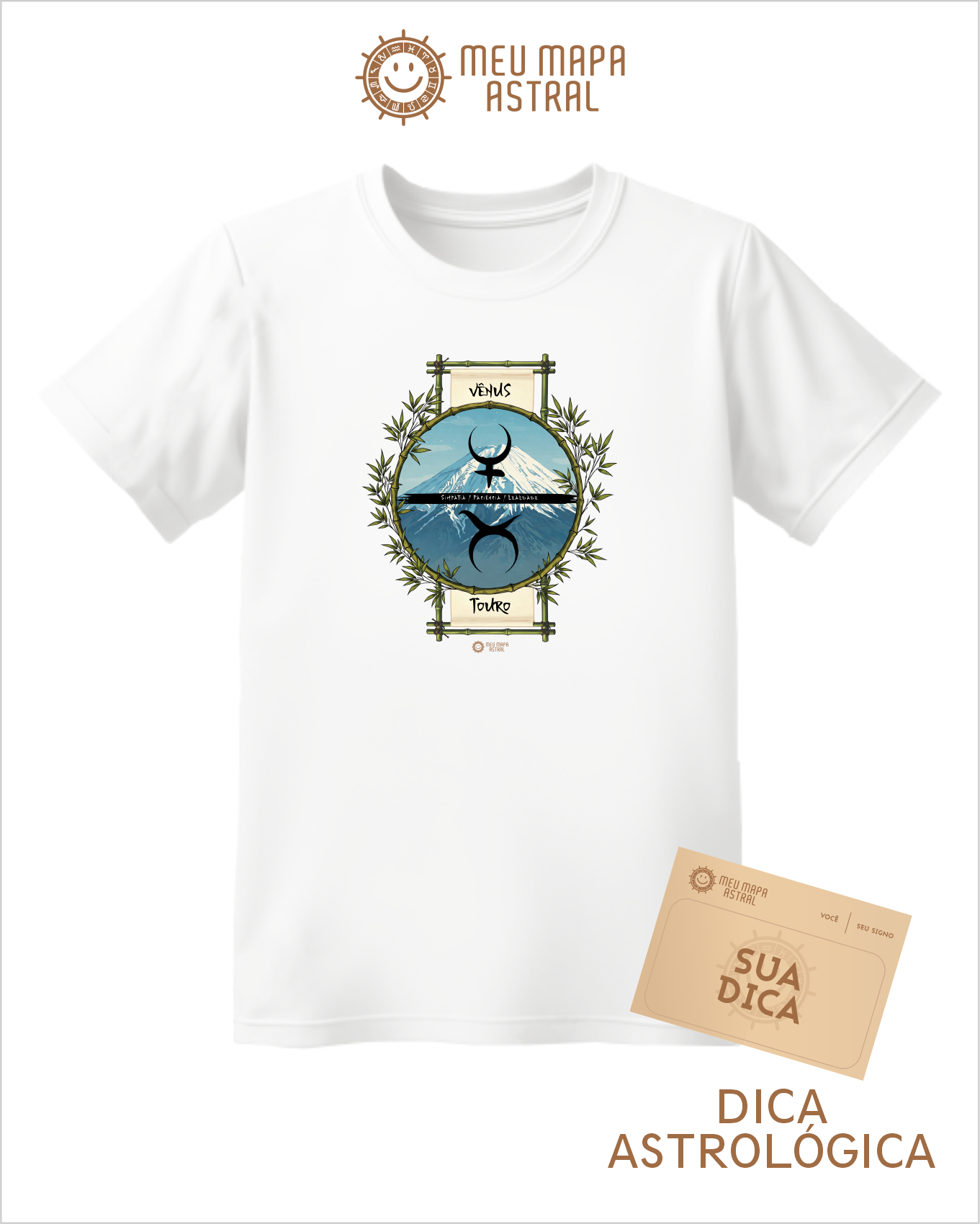 Camiseta Touro/Vênus Ilustrada — Feita 100% de algodão, enquanto você exibe sua energia taurina em uma estampa astrológica do seu signo, com o charme do astro regente Vênus e suas principais características, inspiradas no mestre do ukiyo-e, Katsushika Hokusai.
