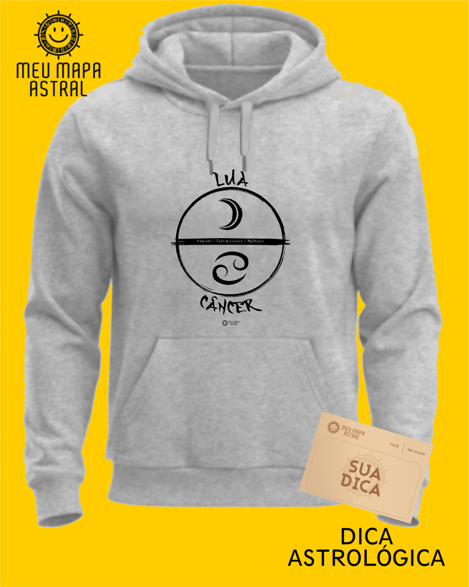 Moletom Câncer/Lua Gráfico — para quem ama surfar nas ondas do emocional com estilo! Moletom aconchegante, com aquele toque fofinho e flanelado por dentro, super confortável, esse moletom traz seu signo Câncer, seu astro regente Lua e suas características mais marcantes, tudo com um toque oriental na estampa.
