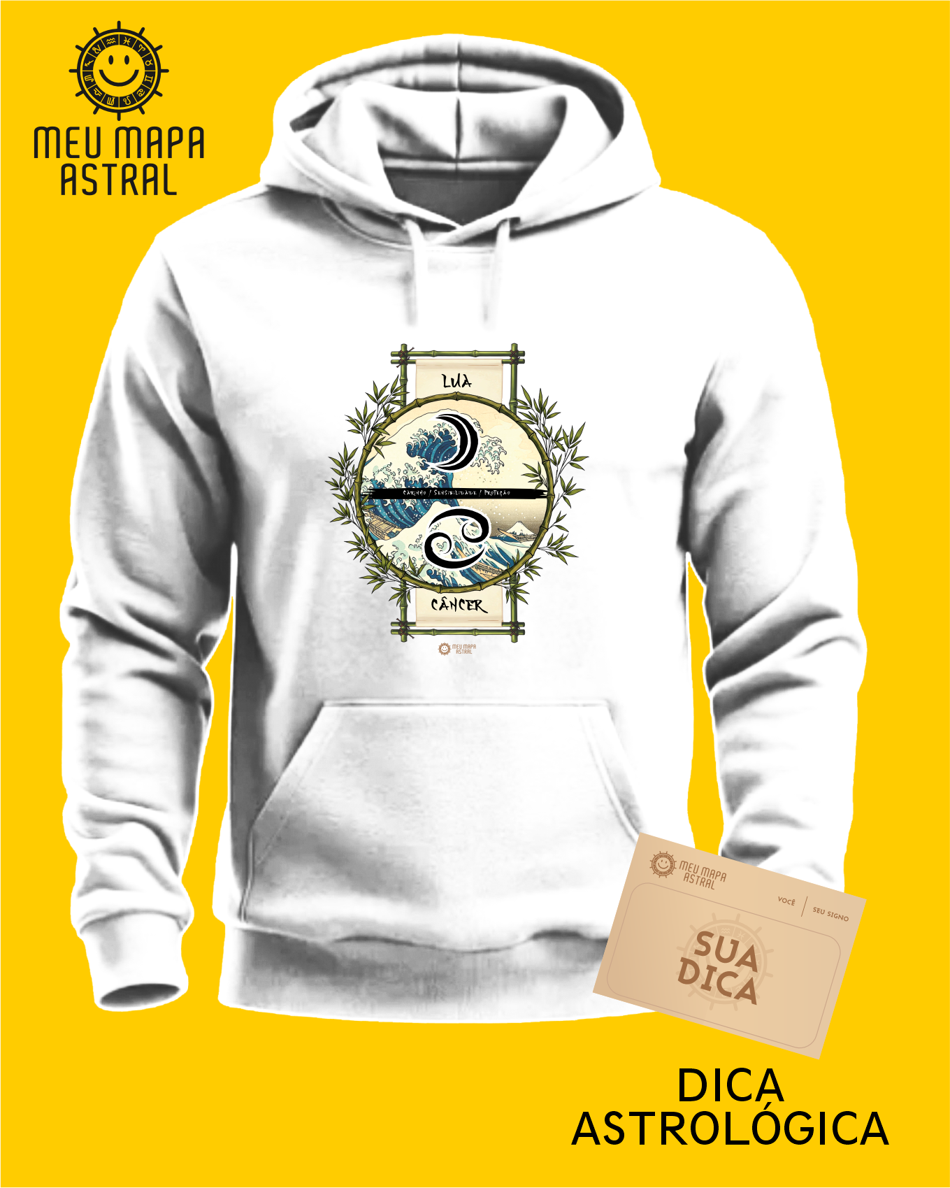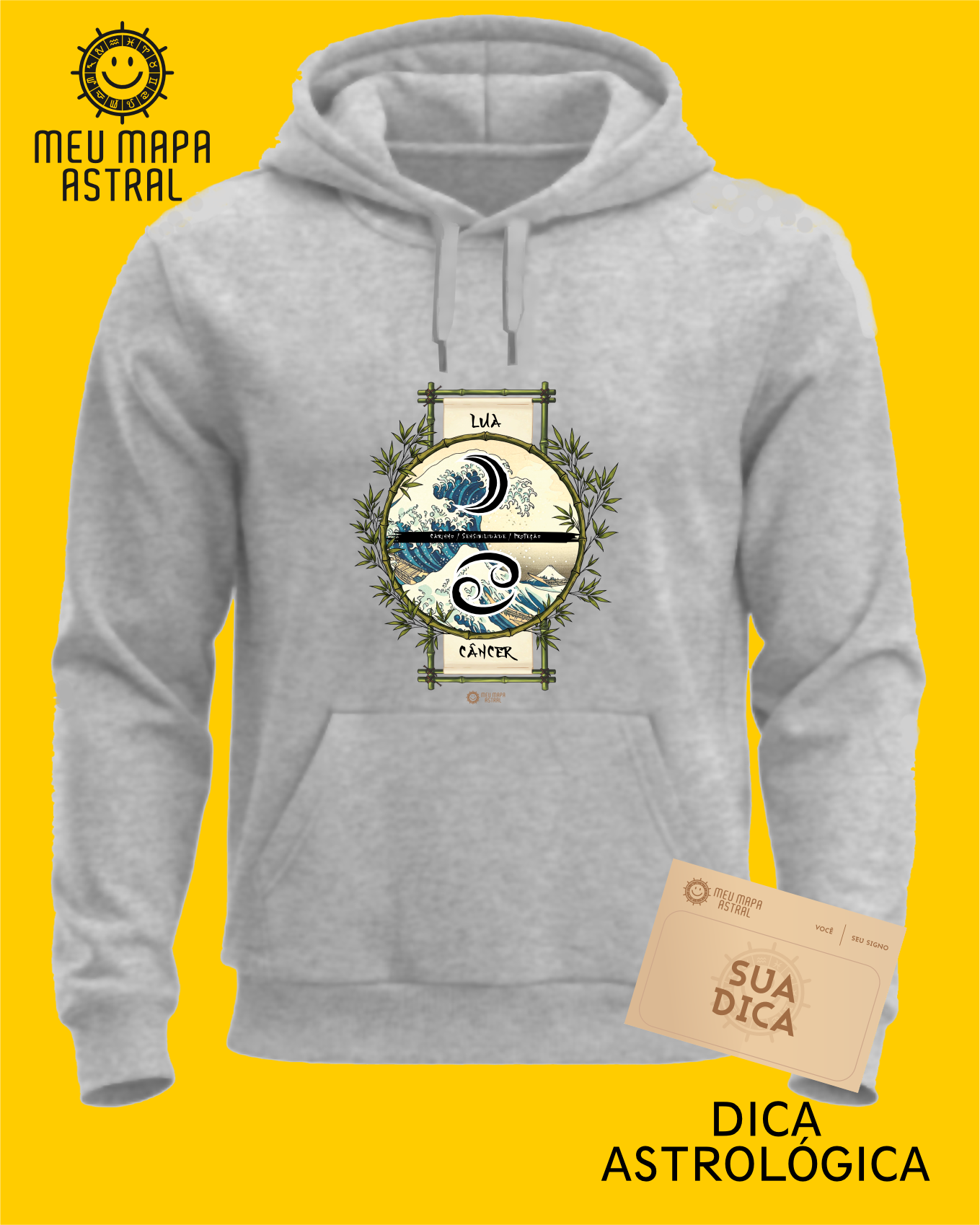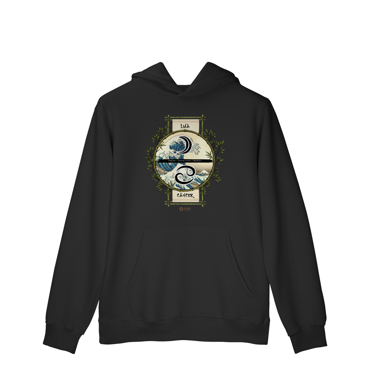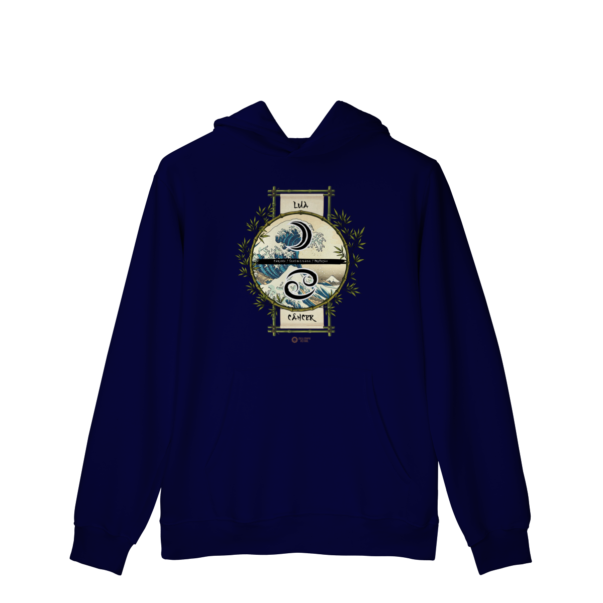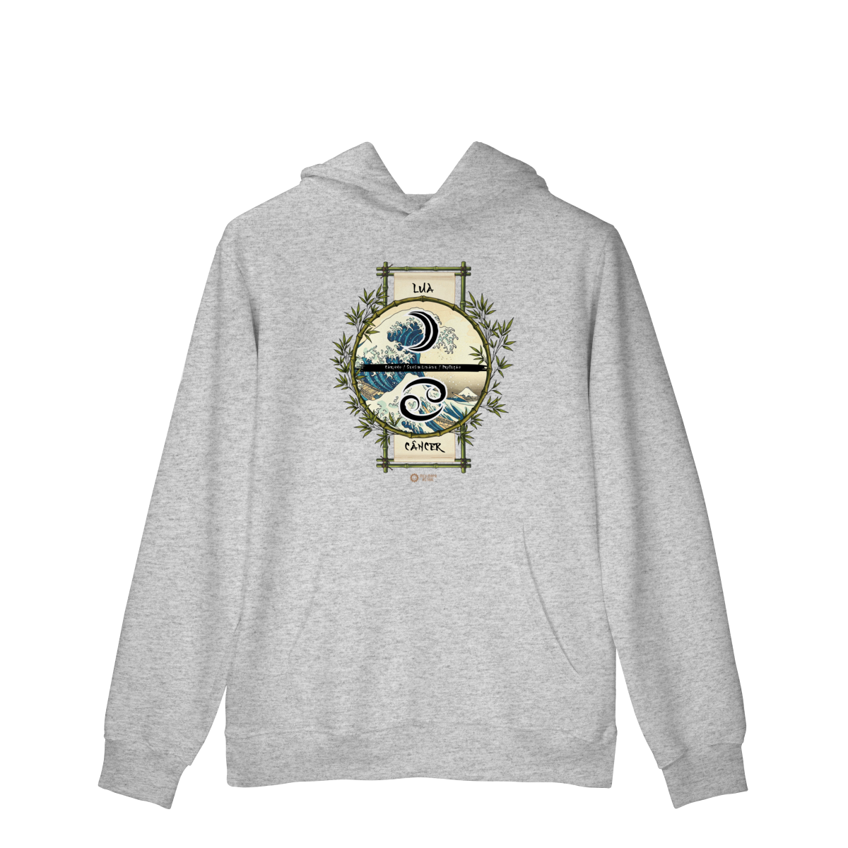 Moletom Câncer/Lua Ilustrado — para quem ama surfar nas ondas do emocional com estilo! Moletom aconchegante, com aquele toque fofinho e flanelado por dentro, super confortável, esse moletom traz seu signo Câncer, seu astro regente Lua e suas características mais marcantes, numa estampa astrológica inspirada no mestre do ukiyo-e, Katsushika Hokusai.