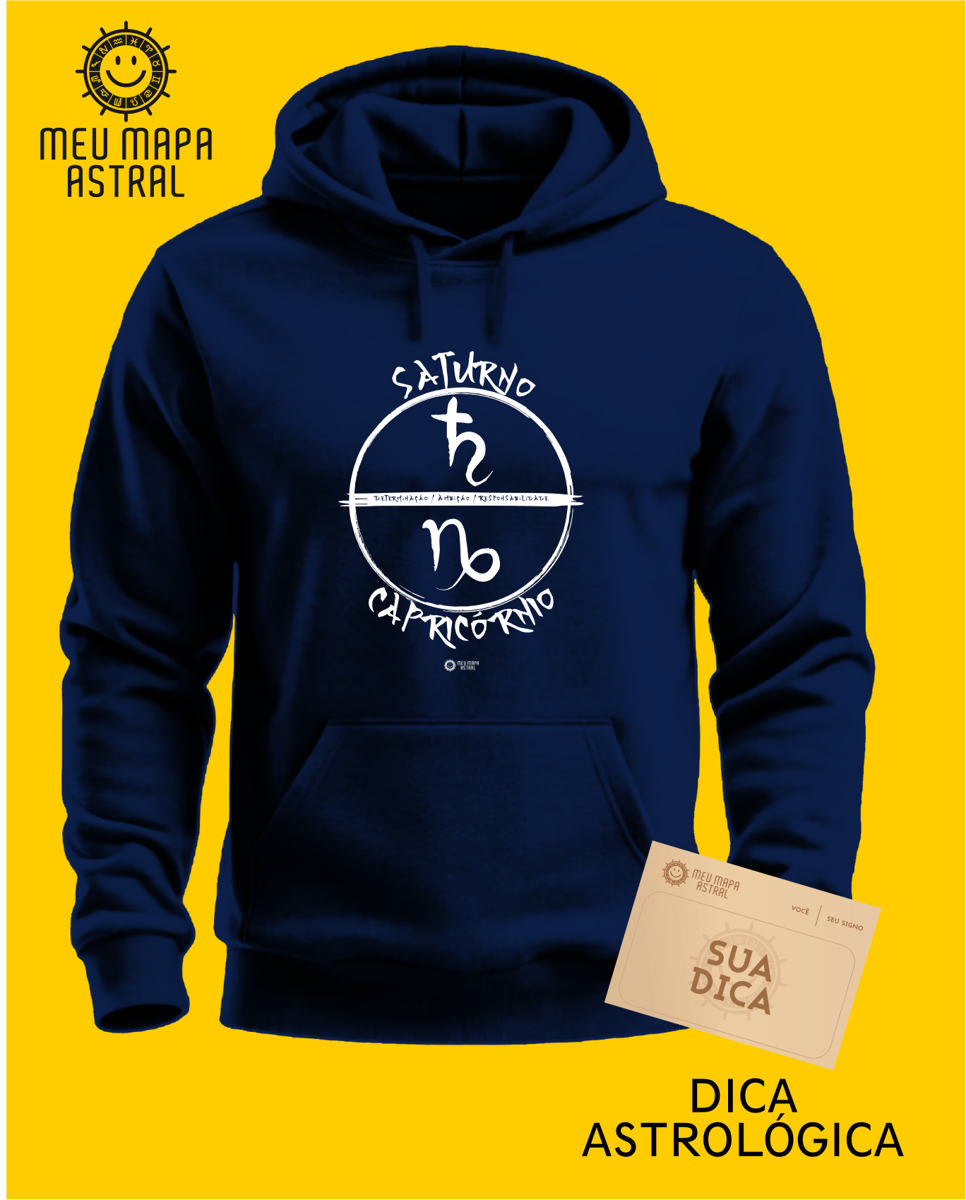 Aconchegante, com aquele toque fofinho e flanelado por dentro, super confortável, esse moletom une conforto e estilo com uma estampa astrológica do signo Capricórnio, seu astro regente Saturno e suas principais características.