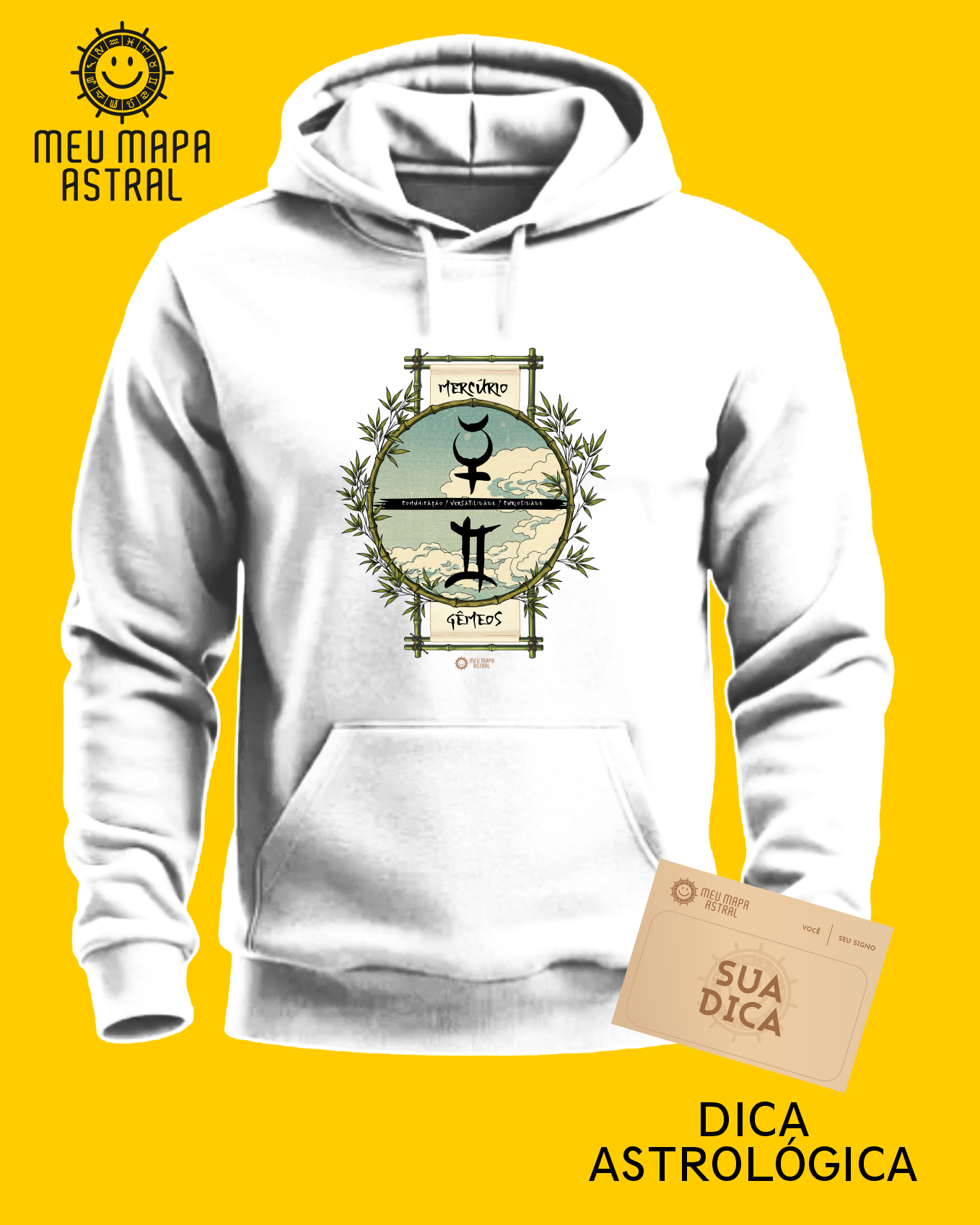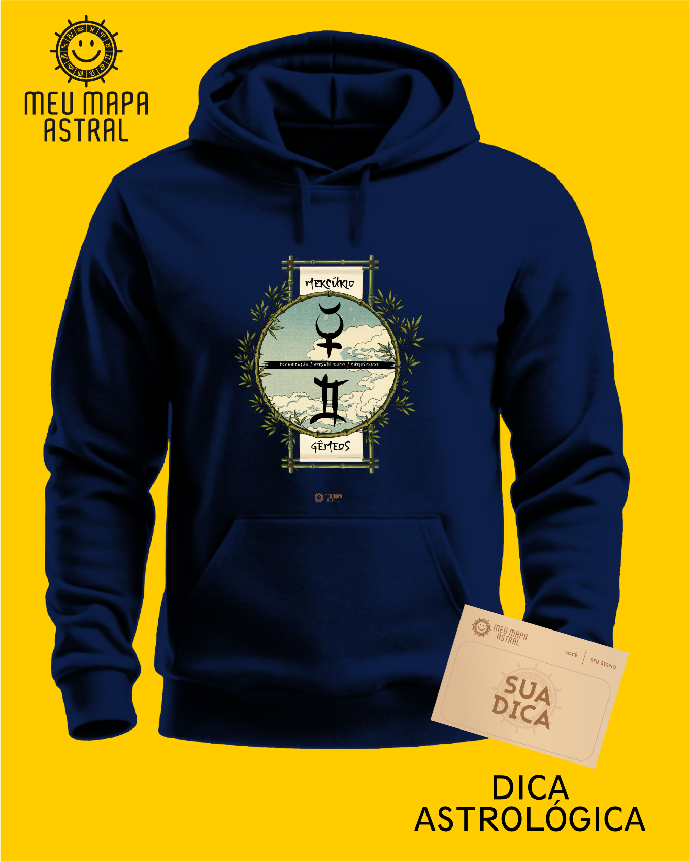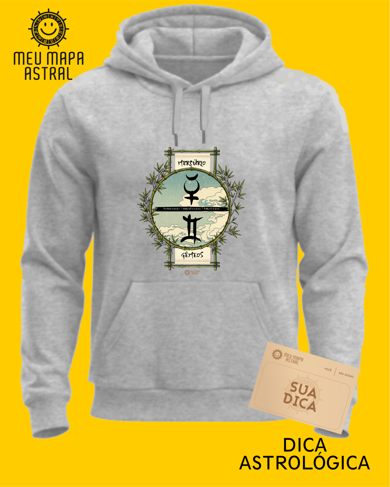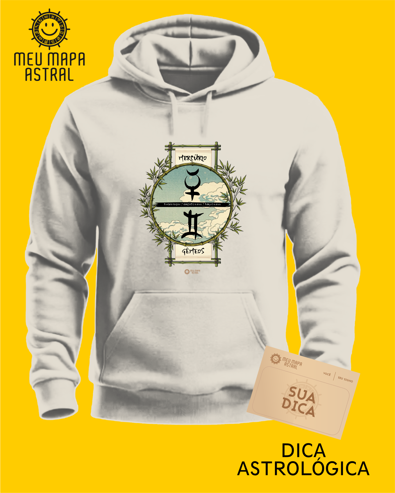 Moletom aconchegante, com aquele toque fofinho e flanelado por dentro, este moletom une seu signo Gêmeos, o astro regente Mercúrio e suas principais características, numa estampa astrológica inspirada no mestre do ukiyo-e, Katsushika Hokusai.
