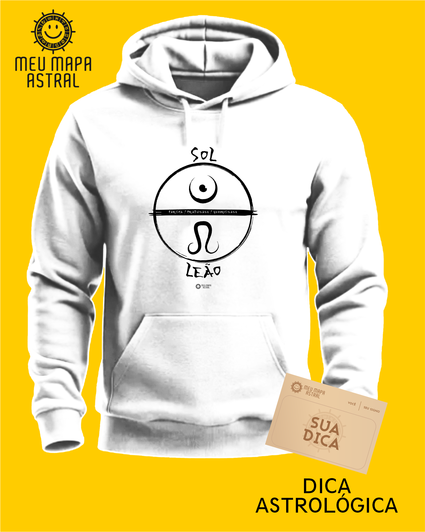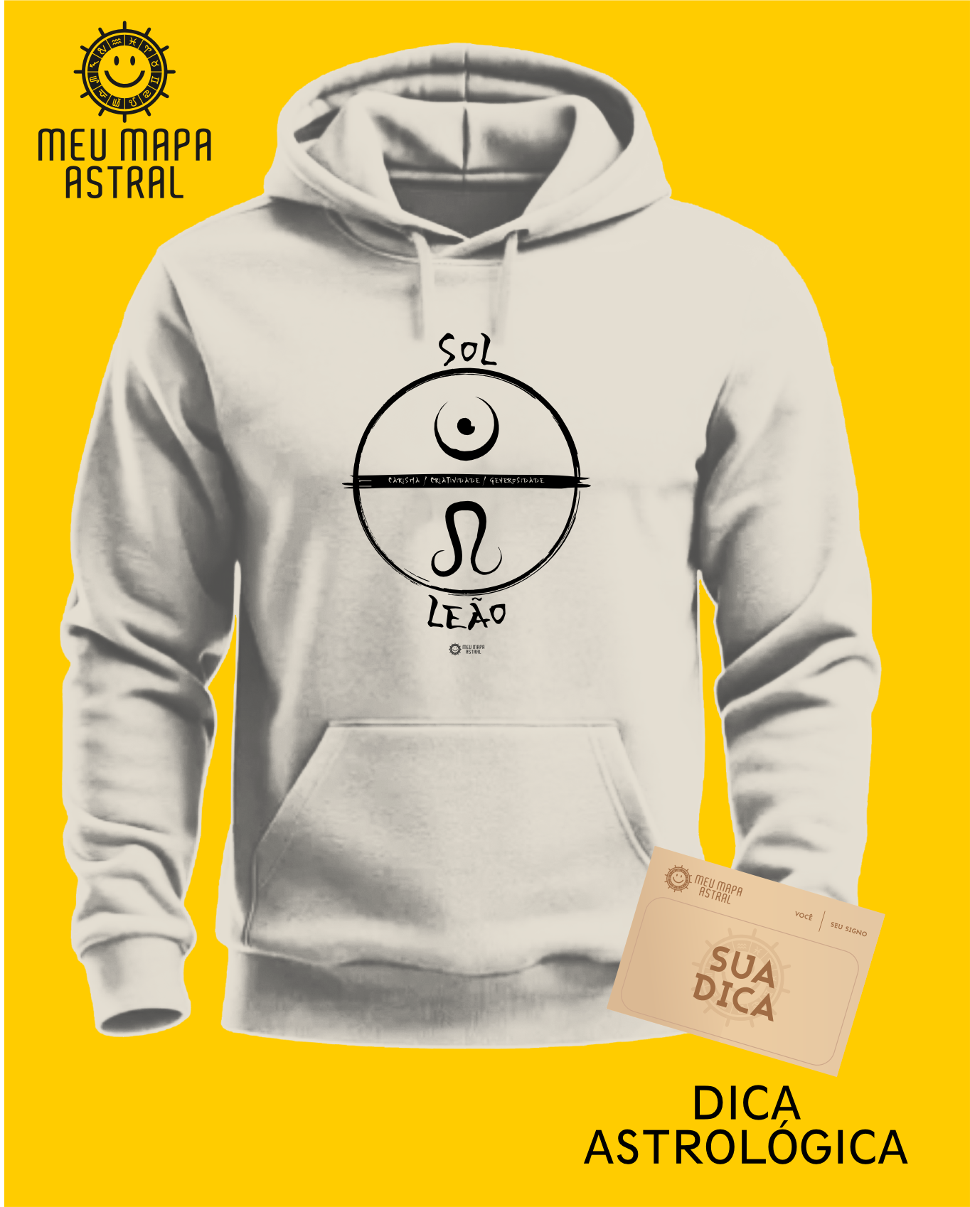 Moletom aconchegante, com aquele toque fofinho e flanelado por dentro, super confortável, ele traz seu signo Leão, seu astro regente Sol e suas principais características em uma estampa astrológica com um toque oriental.
