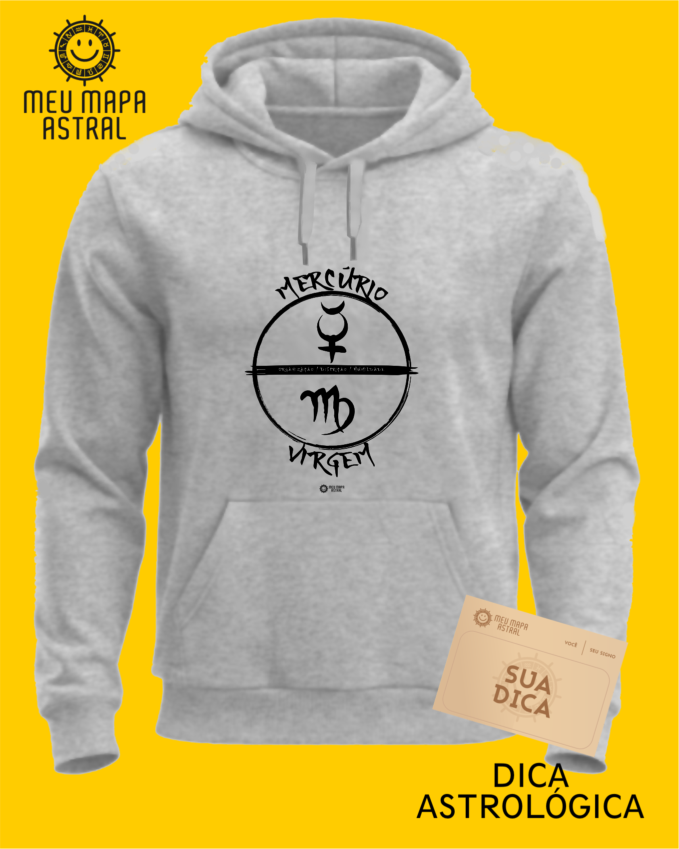 Moletom aconchegante, com aquele toque fofinho e flanelado por dentro, super confortável, ele traz seu signo Virgem, o astro regente Mercúrio e suas principais características numa estampa astrológica com um toque oriental.